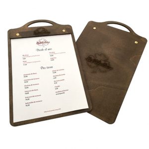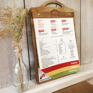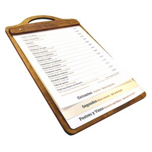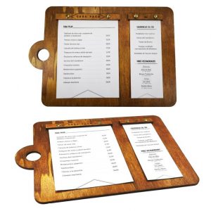 Carta de Madera “Tabla” con grabado láser, elegante y original. Esta carta ofrece la posibilidad de tener divida la oferta gastronómica para definir de una forma clara y de un vistazo nuestras propuestas.